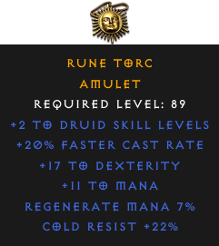 Required Level: 89+2 to Druid Skill Levels+20% Faster Cast Rate+17 to DexterityCold Resist +22%Regenerate Mana 7%+11 to Mana