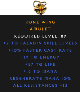 Required Level: 89+2 to Paladin Skill Levels+10% Faster Cast RateAll Resistances +13+57 to LifeRegenerate Mana 10%+16 to Mana+19 to Energy