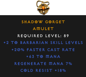 Required Level: 89+2 to Barbarian Skill Levels+20% Faster Cast RateCold Resist +18%Regenerate Mana 7%+63 to Mana