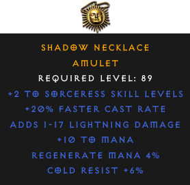 Required Level: 89+2 to Sorceress Skill Levels+20% Faster Cast RateCold Resist +6%Adds DamageRegenerate Mana 4%+10 to Mana