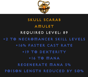 Required Level: 89+2 to Necromancer Skill Levels+16% Faster Cast Rate+19 to DexterityPoison Length Reduced by 50%Regenerate Mana 5%+16 to Mana
