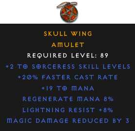 Required Level: 89+2 to Sorceress Skill Levels+20% Faster Cast RateLightning Resist +8%Regenerate Mana 8%+19 to ManaMagic Damage Reduced by 3