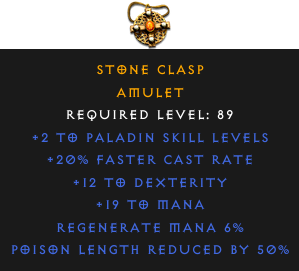 Required Level: 89+2 to Paladin Skill Levels+20% Faster Cast Rate+12 to DexterityPoison Length Reduced by 50%Regenerate Mana 6%+19 to Mana