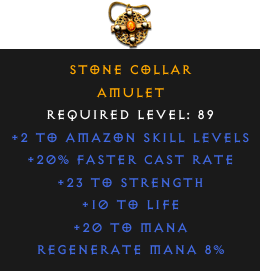 Required Level: 89+2 to Amazon Skill Levels+20% Faster Cast Rate+23 to Strength+10 to LifeRegenerate Mana 8%+20 to Mana