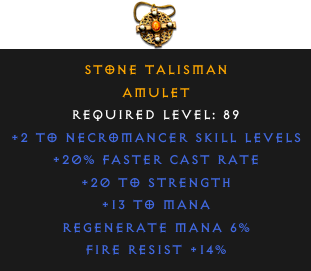 Required Level: 89+2 to Necromancer Skill Levels+20% Faster Cast Rate+20 to StrengthFire Resist +14%Regenerate Mana 6%+13 to Mana