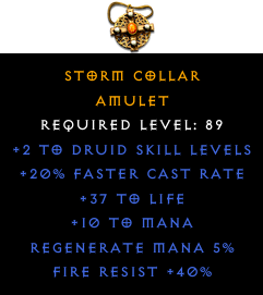 Required Level: 89+2 to Druid Skill Levels+20% Faster Cast Rate+37 to LifeFire Resist +40%Regenerate Mana 5%+10 to Mana