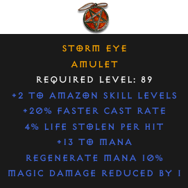Required Level: 89+2 to Amazon Skill Levels+20% Faster Cast Rate4% Life stolen per hitRegenerate Mana 10%+13 to ManaMagic Damage Reduced by 1