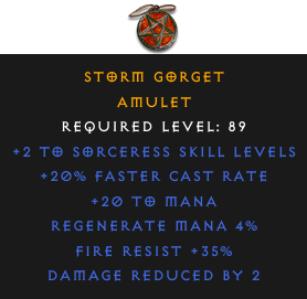 Required Level: 89+2 to Sorceress Skill Levels+20% Faster Cast RateFire Resist +35%Regenerate Mana 4%+20 to ManaDamage Reduced by 2