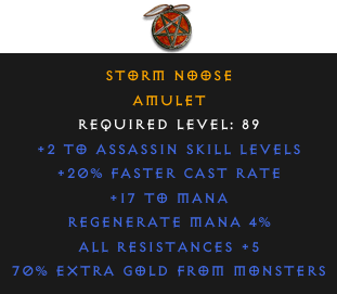 Required Level: 89+2 to Assassin Skill Levels+20% Faster Cast RateAll Resistances +5Regenerate Mana 4%70% Extra Gold from Monsters+17 to Mana