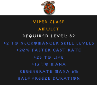 Required Level: 89+2 to Necromancer Skill Levels+20% Faster Cast Rate+25 to LifeHalf Freeze DurationRegenerate Mana 6%+13 to Mana