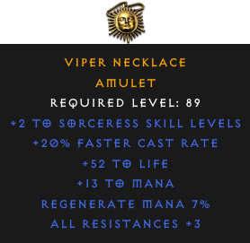 Required Level: 89+2 to Sorceress Skill Levels+20% Faster Cast RateAll Resistances +3+52 to LifeRegenerate Mana 7%+13 to Mana