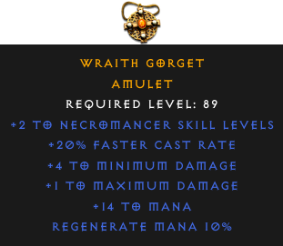 Required Level: 89+2 to Necromancer Skill Levels+20% Faster Cast Rate+1 to Maximum DamageRegenerate Mana 10%+4 to Minimum Damage+14 to Mana