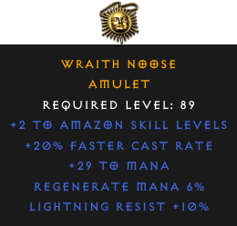 Required Level: 89+2 to Amazon Skill Levels+20% Faster Cast RateLightning Resist +10%Regenerate Mana 6%+29 to Mana