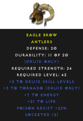 Required Level: 42+2 to Druid Skill LevelsDefense: 20+3 to Tornado (Druid only)Socketed (2)+21 to LifePoison Resist +22%+7 to Energy