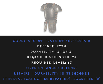 Required Level: 63Defense: 2290Socketed (2)+191% Enhanced DefenseRepairs Durability