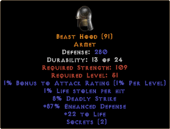 Defense: 280Durability: 13 of 24Required Strength: 109Required Level: 511% Bonus to Attack Rating (1% Per Level)1% Life stolen per hit8% Deadly Strike+87% Enhanced Defense+22 to Life Sockets (2)