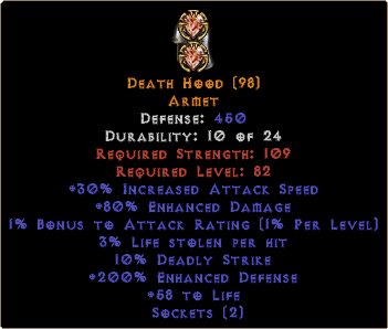 Defense: 450Durability: 10 of 24Required Strength: 109Required Level: 82+30% Increased Attack Speed+80% Enhanced Damage1% Bonus to Attack Rating (1% Per Level)3% Life stolen per hit10% Deadly Strike+200% Enhanced Defense+58 to Life Sockets (2)