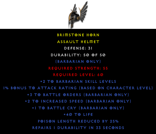 Assault Helmet: Brimstone HornRequired Level: 60 Rarity: rare | Select the realm to see the price |