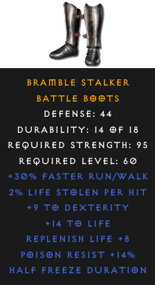 Required Level: 60Defense: 44+30% Faster Run/Walk+9 to DexterityReplenish Life +8+14 to LifePoison Resist +14%Half Freeze Duration2% Life stolen per hit