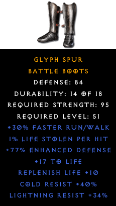 Required Level: 51Defense: 84+30% Faster Run/WalkReplenish Life +10+17 to LifeCold Resist +40%Lightning Resist +34%+77% Enhanced Defense1% Life stolen per hit