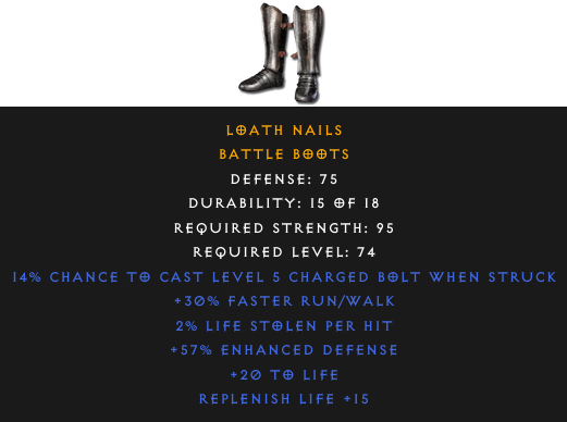 Required Level: 74Defense: 75+30% Faster Run/WalkReplenish Life +15+20 to Life+57% Enhanced Defense2% Life stolen per hit