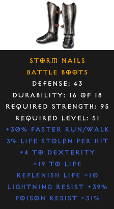 Required Level: 51Defense: 43+30% Faster Run/Walk+4 to DexterityReplenish Life +10+19 to LifePoison Resist +31%Lightning Resist +39%3% Life stolen per hit