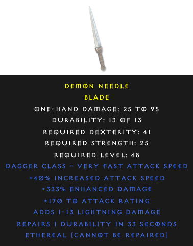 Required Level: 48+40% Increased Attack Speed+170 to Attack Rating+333% Enhanced DamageAdds DamageRepairs Durability