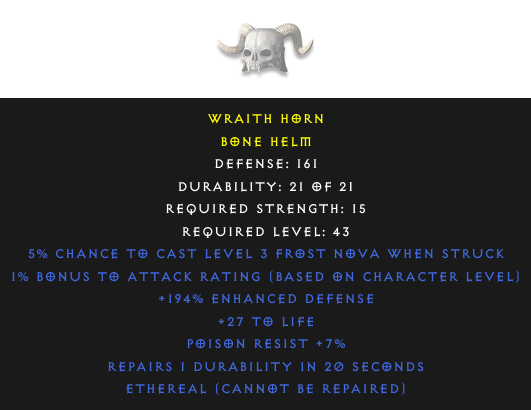 Required Level: 43Defense: 1611% Bonus to Attack Rating (Based on Character Level)+27 to LifePoison Resist +7%+194% Enhanced DefenseRepairs Durability