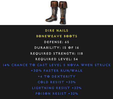 Required Level: 54Defense: 65+30% Faster Run/Walk+4 to DexterityPoison Resist +32%Cold Resist +33%Lightning Resist +33%