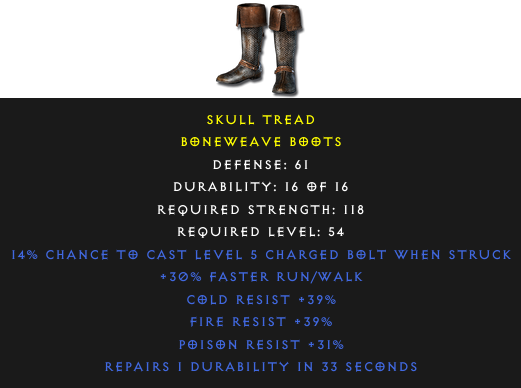 Required Level: 54Defense: 61+30% Faster Run/WalkPoison Resist +31%Cold Resist +39%Fire Resist +39%Repairs Durability