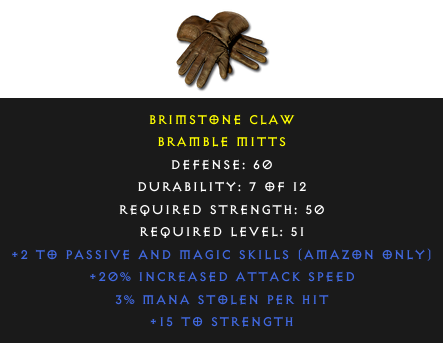 Required Level: 51Defense: 60+2 to Passive and Magic Skills (Amazon only)+20% Increased Attack Speed+15 to Strength3% Mana stolen per hit