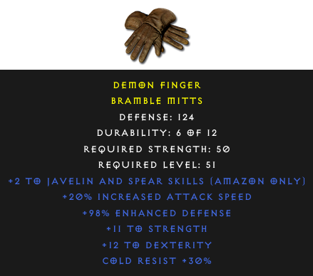 Required Level: 51Defense: 124+2 to Javelin and Spear Skills (Amazon only)+20% Increased Attack Speed+11 to Strength+12 to DexterityCold Resist +30%+98% Enhanced Defense