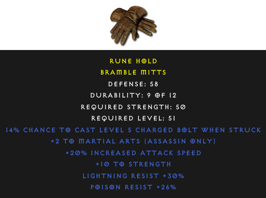 Required Level: 51Defense: 58+2 to Martial Arts (Assassin only)+20% Increased Attack Speed+10 to StrengthPoison Resist +26%Lightning Resist +30%