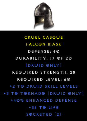 Required Level: 60+2 to Druid Skill LevelsDefense: 40+3 to Tornado (Druid only)Socketed (2)+38 to Life+40% Enhanced Defense