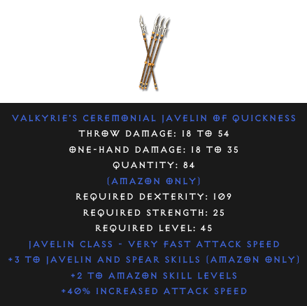 Required Level: 45+2 to Amazon Skill Levels+3 to Javelin and Spear Skills (Amazon only)+40% Increased Attack Speed