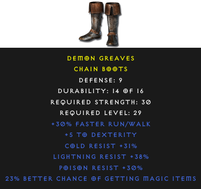 Chain Boots: Demon GreavesRequired Level: 29 Rarity: rare | Select the realm to see the price |