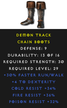 Required Level: 29Defense: 9+30% Faster Run/Walk+4 to DexterityPoison Resist +32%Cold Resist +34%Fire Resist +36%