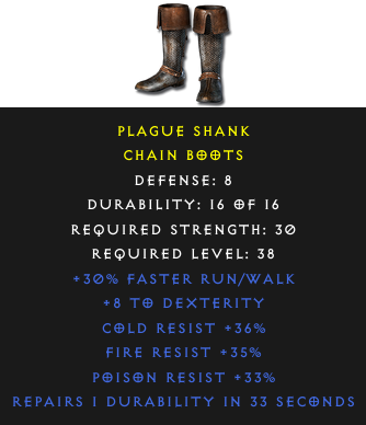 Required Level: 38Defense: 8+30% Faster Run/Walk+8 to DexterityPoison Resist +33%Cold Resist +36%Fire Resist +35%Repairs Durability