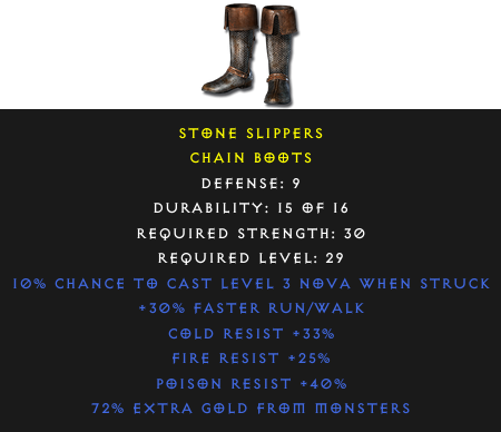Required Level: 29Defense: 9+30% Faster Run/WalkPoison Resist +40%Cold Resist +33%Fire Resist +25%72% Extra Gold from Monsters