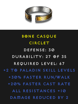 Required Level: 67+2 to Paladin Skill LevelsDefense: 30+20% Faster Cast Rate+30% Faster Run/WalkAll Resistances +10Damage Reduced by 2