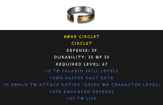 Required Level: 67+2 to Paladin Skill LevelsDefense: 391% Bonus to Attack Rating (Based on Character Level)+20% Faster Cast Rate+33 to Life+29% Enhanced Defense