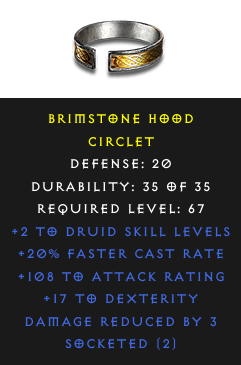Required Level: 67+2 to Druid Skill LevelsDefense: 20+20% Faster Cast Rate+17 to DexteritySocketed (2)+108 to Attack RatingDamage Reduced by 3