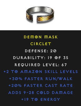 Required Level: 67+2 to Amazon Skill LevelsDefense: 20+20% Faster Cast Rate+30% Faster Run/WalkAdds Cold Damage+19 to Energy