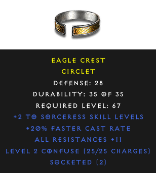 Required Level: 67+2 to Sorceress Skill LevelsDefense: 28+20% Faster Cast RateAll Resistances +11Socketed (2)