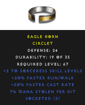 Required Level: 67+2 to Sorceress Skill LevelsDefense: 24+20% Faster Cast Rate+20% Faster Run/WalkSocketed (2)7% Mana stolen per hit