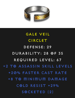 Required Level: 67+2 to Assassin Skill LevelsDefense: 29+20% Faster Cast RateSocketed (2)Cold Resist +29%+8 to Minimum Damage