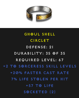 Required Level: 67+2 to Sorceress Skill LevelsDefense: 21+20% Faster Cast RateSocketed (2)+57 to Life7% Life stolen per hit