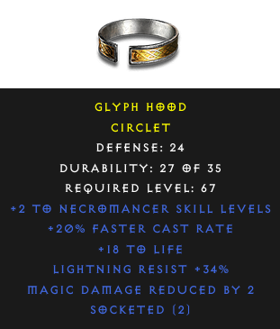Required Level: 67+2 to Necromancer Skill LevelsDefense: 24+20% Faster Cast RateSocketed (2)+18 to LifeLightning Resist +34%Magic Damage Reduced by 2