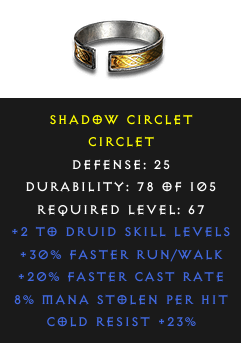 Required Level: 67+2 to Druid Skill LevelsDefense: 25+20% Faster Cast Rate+30% Faster Run/WalkCold Resist +23%8% Mana stolen per hit
