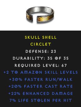 Required Level: 67+2 to Amazon Skill LevelsDefense: 23+20% Faster Cast Rate+30% Faster Run/Walk+22% Enhanced Damage7% Life stolen per hit